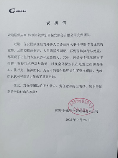 安姆科-东莞奇妙包装有限公司致信表扬我司铁保宏泰深圳保安公司安保团队在应对外协人员恶意闯入事件中整体表现值得称赞,为客户公司的安全秩序提供了坚实保障,极大维护了公司的和谐稳定作出了重要贡献。